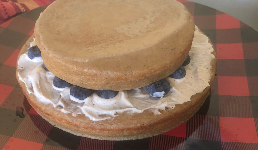 Let the cake cool completely before decorating with organic whipped cream and organic fruit.